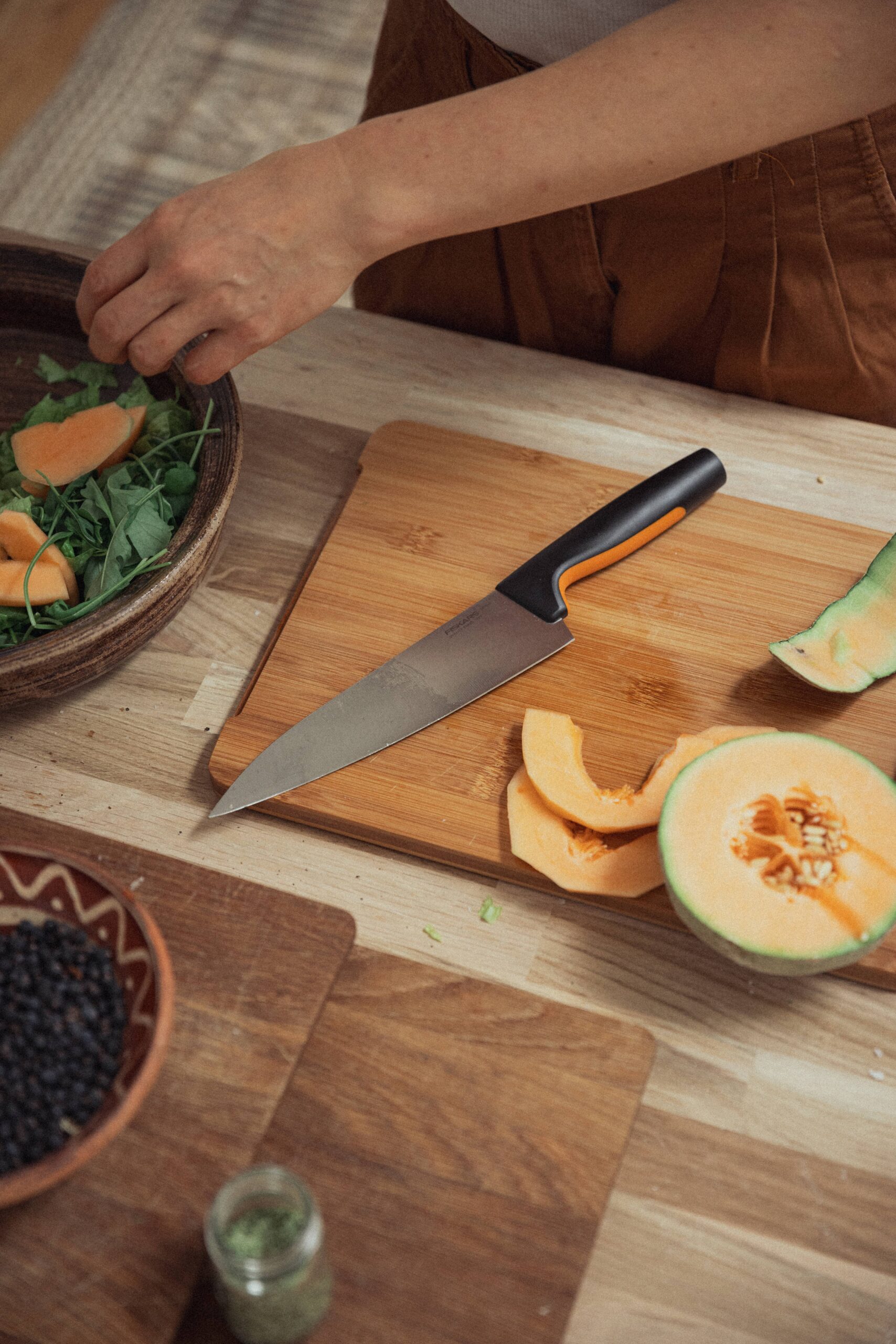 Snygg förvaring möter hållbar design – det ultimata knivsetet för det moderna köket. Fiskars Functional Form knivblock i bambu är framtaget för dig som vill ha ordning och reda på köksbänken utan att pruta på kvaliteten. Det kompakta knivblocket är tillverkat av FSC®-certifierad bambu och hållbar plast, vilket ger en varm och naturlig känsla i köket samtidigt som det sparar värdefull arbetsyta.