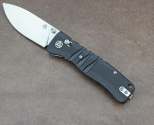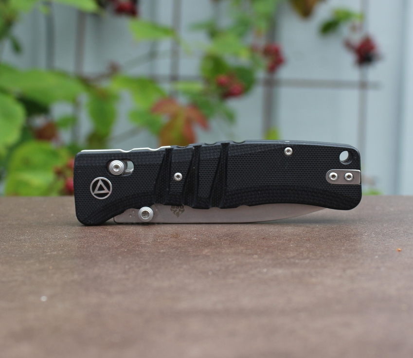 Presentationssidan av pivotskrufen visar QSP triangellogo som återkommer på en del av sortimentet. Den sidan är också D-formad vilket gör att den inte roterar om du vill demontera kniven. Något jag rekommenderar att du inte gör om du inte är erfaren. Den här typen av lås är lite knepigare att pilla tillbaks än säg ett ramlås.