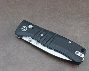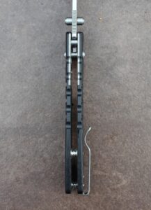 Gången får mycket väl godkänt. Delar av det kan förstås tillskrivas de keramiska kullagren. Men även till sjäolva konstruktionen. På knivar med den här typen av lås saknas detent-kula. Istället är det “omegafjädrarna” som håller låsbulten på plats som står för motståndet. Här är det så starkt att det ger en bra snärt när bladet skall fällas ut. Vad bättre är att fjäderspänsten även gör att knivbladet inte på något vis kan skakas ur handtaget.