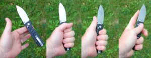 Ripley har ett övervägande bra grepp. Kramar man handtaget riktigt hårt kan det bli lite problem med de ovan nämnda räfflorna och clipet som kan kännas lite mot handen men inte mycket. Sedan kan den främre fördjupningen för fingrarna vara mer eller mindre bra beroende på handstorlek. För mig blir det nämligen lite av en “en och ett halvt fingersfördjupning” vilket gör att långfingret har en tendens att hamna uppe på den lilla knöl som bildas. Men det är mest i ett hårt hammargrepp det upplevs så. I ett sagbelgrepp hjälper snarare den detaljen till med något för handen att ta spjärn emot på ett positivt vis. Så det beror på fattningen.