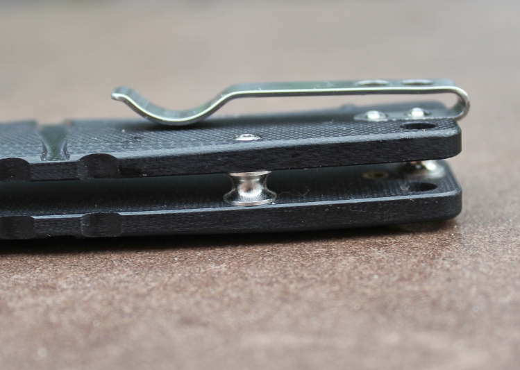 Handtaget på den här kniven är uppbyggt kring en partiell ram som innehåller låset. I övrigt är kniven öppen i ryggen sånär som på två distanser som håller ihop handtagssidorna. De är skruvade från två håll med T6-skruvar. I den justerbara pivotskruven hittas storlek T8. Om det vill jag bara säga, dumpa T6-orna. De är så små att minsta lilla glapp om du skall spänna dem eller plocka isär kniven riskerar att strippa dem.